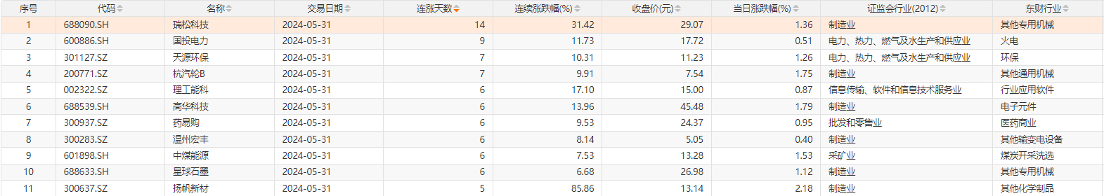 5月31日消息,Choice数据统计,A股今日1只个股连续14天上涨,为瑞松科技;1只个股连续9天上涨,为国投电力;此外,天源环保连续7天上涨;理工能科、高华科技、药易购等6只个股连续6天上涨。