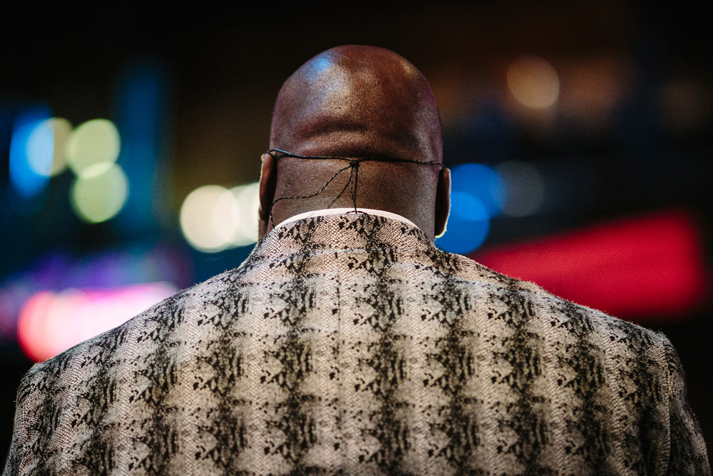 同样是一位女球迷,她在街头注目观看NBA狂欢巡游,身上的一系列珠子装饰尤其特别。