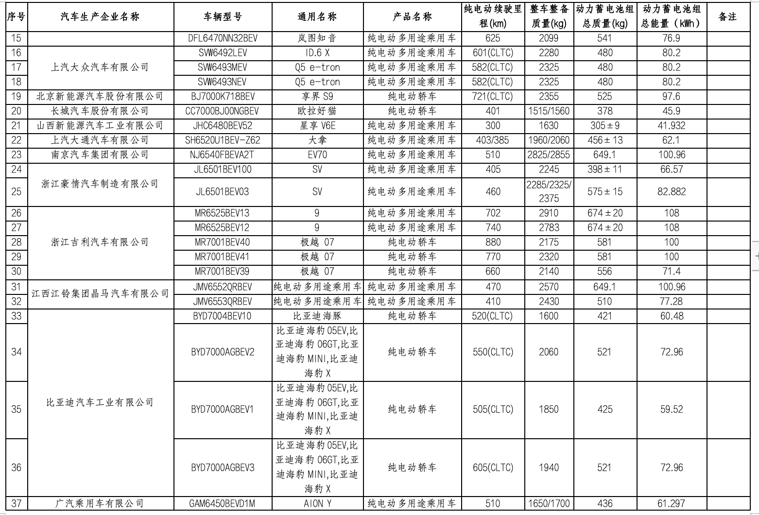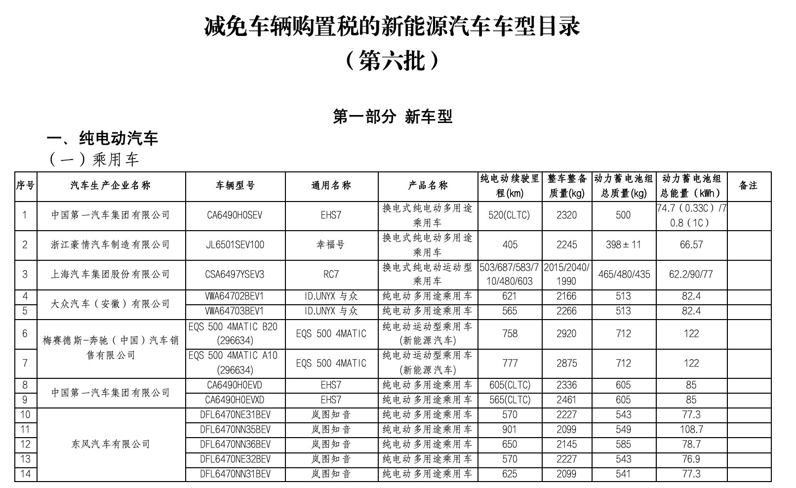 工信部公布减免车辆购置税的新能源汽车车型目录(第六批)