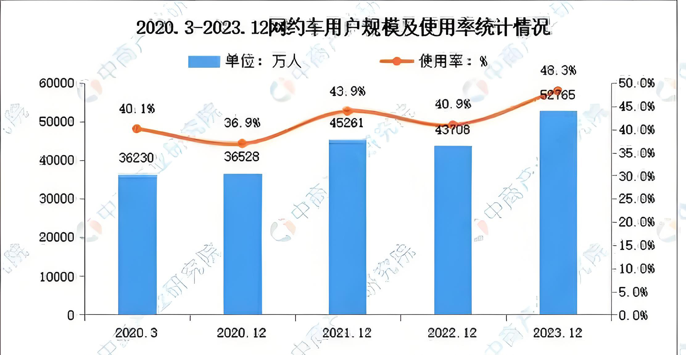 图/2020年3月-2023年12月网约车用户规模 来源/中商情报网