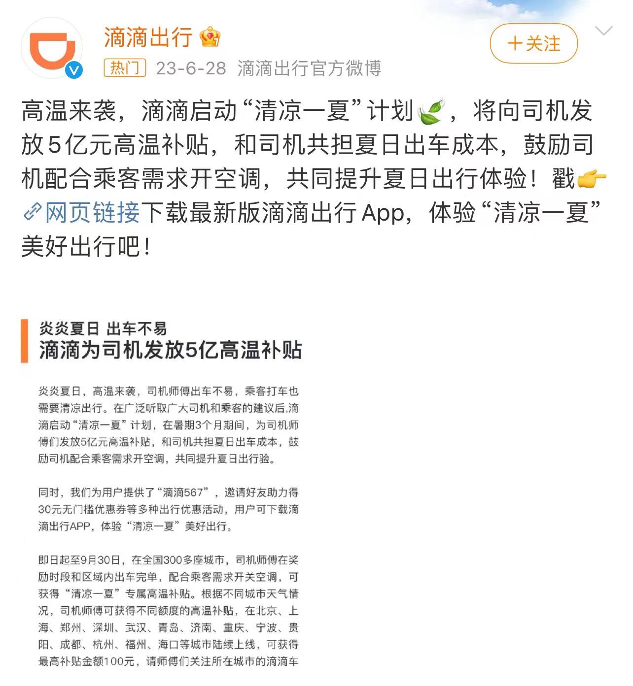 图/滴滴平台发放5亿高温补贴公告