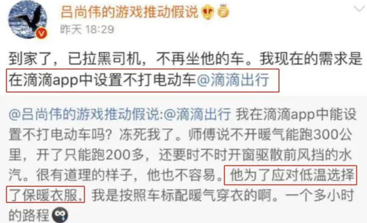 2019年冬季,某一杂志的执行主编,发文称,要被冻死了,如何能在滴滴app中设置不打电动车,并@滴滴出行。