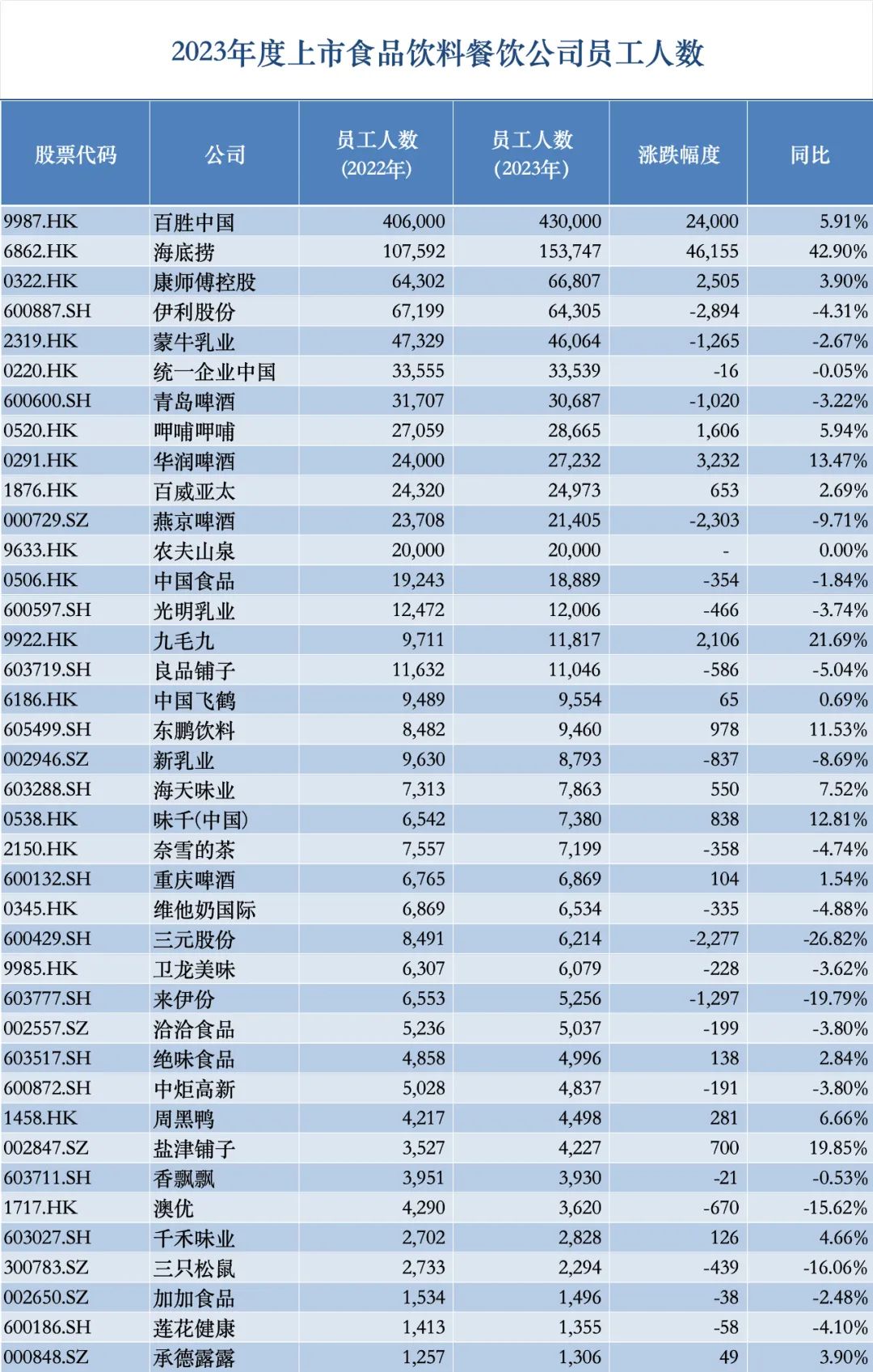 统计显示,纳入统计的餐饮公司去年增员情况可观。其中,服务员跳起了“科目三”的海底捞,其增幅达到42.90%;九毛九以21.69%的涨幅排在海底捞之后;另外,味千(中国)、百胜中国和呷哺呷哺在员工人数上也有不同程度的增长。