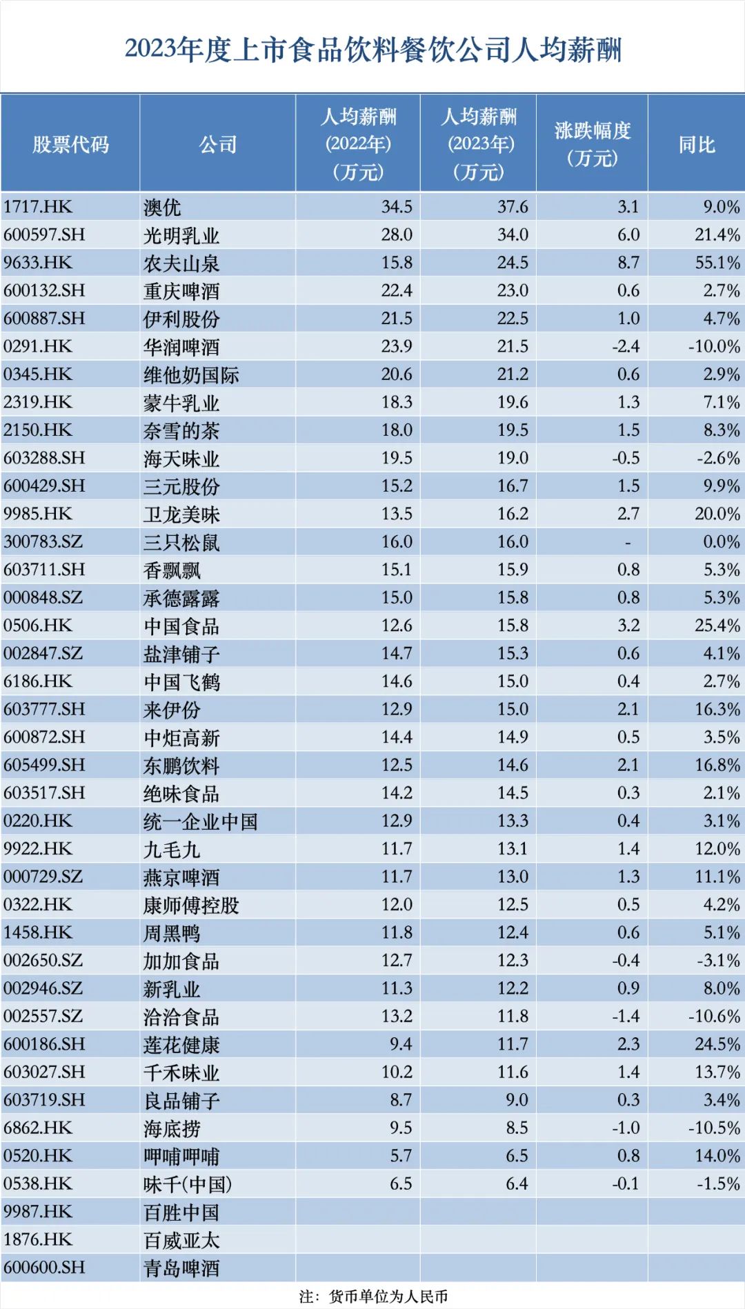 经初步统计发现,在雇员人数上,食品饮料行业出现两重天:有17家公司员工增加了,但也有过半数人员减少了。除此之外,数据似乎还藏着打工人加薪的“小秘密”。例如,从人均薪酬的角度,有一家头部饮料公司去年增加幅度超过55%。