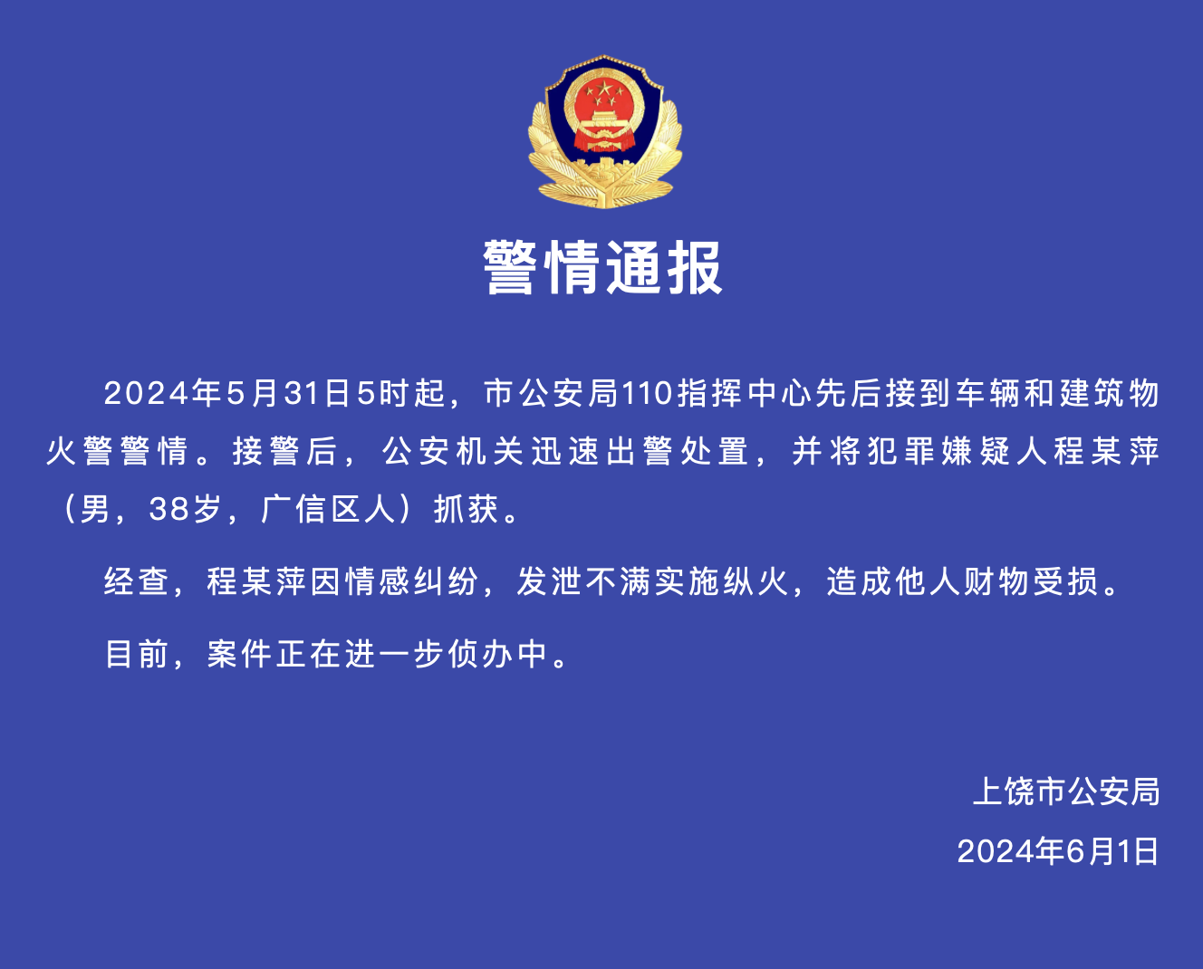 江西上饶市公安局6月1日发布警情通报:5月31日5时起,市公安局110指挥中心先后接到车辆和建筑物火警警情。接警后,公安机关迅速出警处置,并将犯罪嫌疑人程某萍(男,38岁,广信区人)抓获。经查,程某萍因情感纠纷,发泄不满实施纵火,造成他人财物受损。目前,案件正在进一步侦办中。