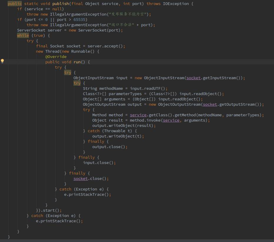 服务端发布服务的代码如上,首先校验传入的端口和服务是否合法,然后开启一个 socket 监听,这儿为了简便,没有采用 NIO 方式,同时直接采用 java 的序列化方式,将传入的数据通过反射取出调用的方法和参数,本地执行后将运行结果通过 socket 套接字返回给客户端。