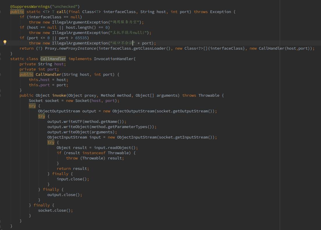 框架中客户端调用的代码中,首先校验对应的端口和主机是否合法,然后通过动态代理生成一个代理对象,在代理对象的方法中,拦截调用,通过建立 socket 连接,将方法和参数传递到远端执行并获取远程执行返回结果。