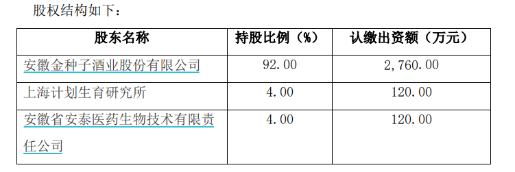 金种子以认缴2760万元持有公司92%的股权,另外8%的股权由上海计划生育研究所和安徽省安泰医药生物技术有限责任公司持有。