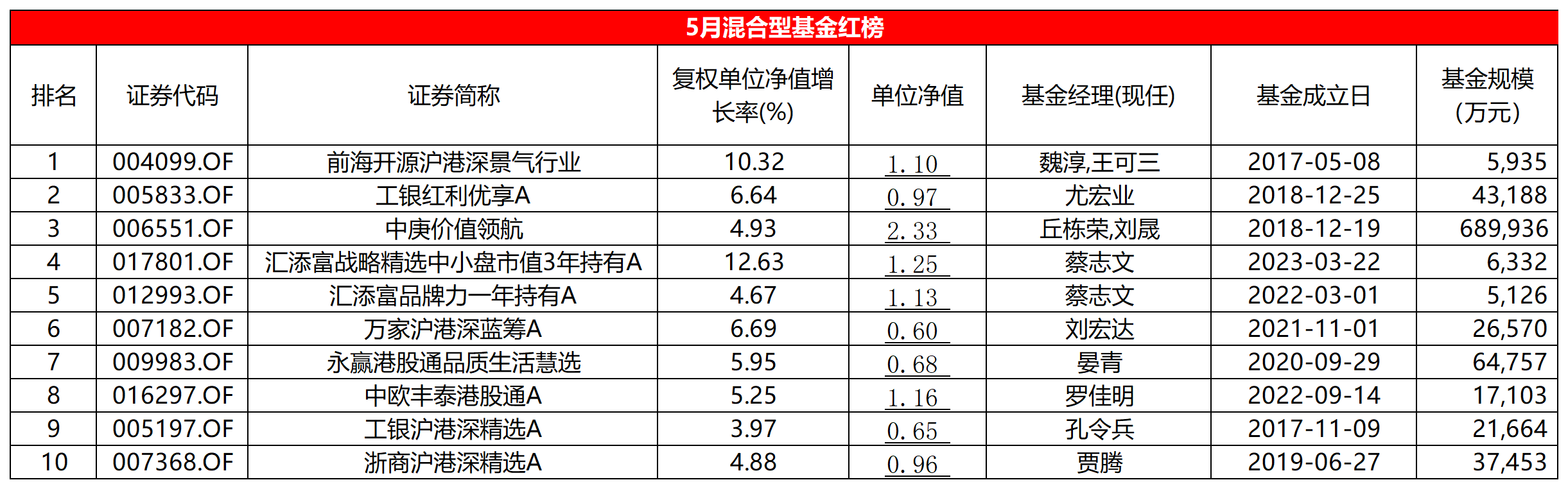 红榜的10只基金中,仅简称中含“港”的就有6只。其中,前海开源沪港深景气行业、汇添富战略精选中小盘两只基金的5月份收益率均超过了10%。