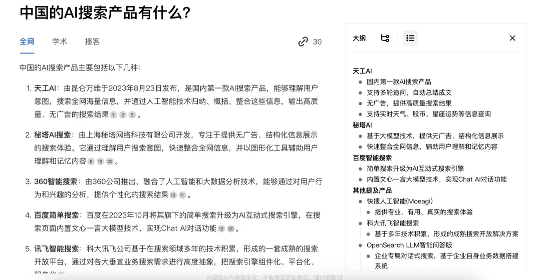 另一类则专门推出了AI搜索产品,比如360搜索、秘塔搜索、天工AI搜索、百川AI搜索百小应、百度简单搜索等等。