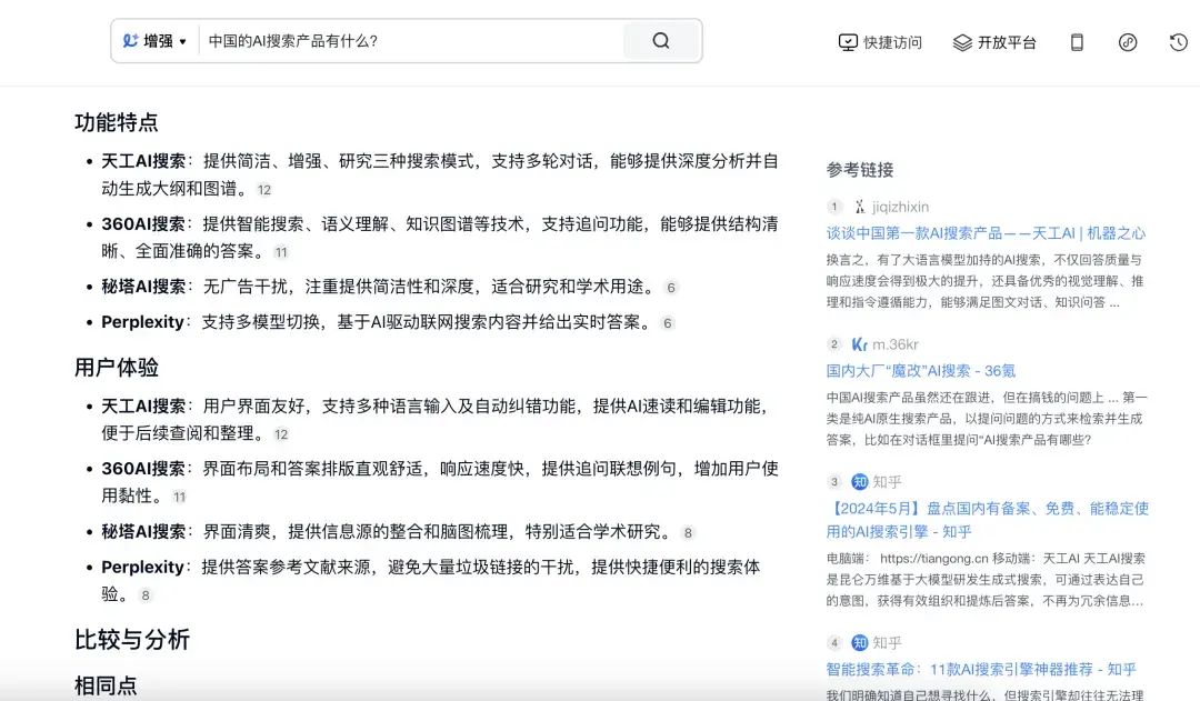 但从搜索结果来看,天工搜索不仅整理出了AI搜索的产品,在增强版中分析出了他们的功能特点、用户体验,同时比较和分析了它们的相同点和不同点,更加理解用户提问的意图。