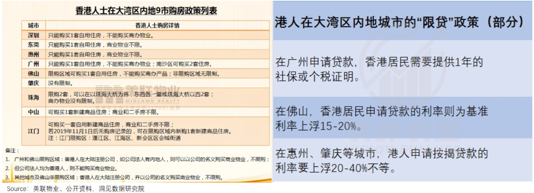 也和内地限购政策有关,可以看到,此前香港居民在大湾区9个城市均有各种限购、贷款等方面的限制。