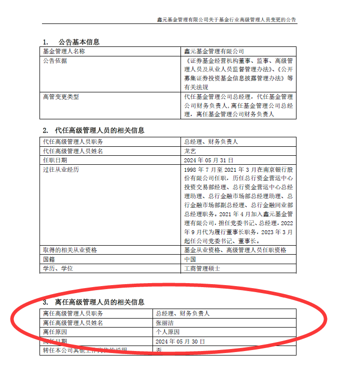 6月1日,鑫元基金发布公告称,公司总经理、财务负责人张丽洁因个人原因宣告离任,不再转任公司其他岗位,其离任日期为2024年5月30日。