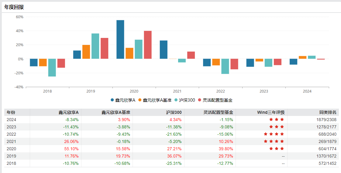 截至2024年5月31日,鑫元鑫动力A和鑫元欣悦A均没有实现正收益,基金单位净值分别为0.7153元和0.7362,成立至今的总回报分别为-28.47%和-26.38%,双双跑输同期业绩比较基准(分别为沪深300指数收益率*60%+恒生指数收益率*20%+中证全债指数收益率*20%和沪深300指数收益率*65%+中证全债指数收益率*20%+恒生指数收益率*15%),后者同期回报率分别为-22.71% 和-7.54%。