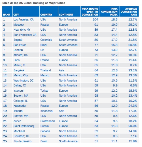 排在第二名的莫斯科为91小时,第三名纽约89个小时。旧金山、波哥大、圣保罗、伦敦、亚特兰大、巴黎和迈阿密分列四至十名。