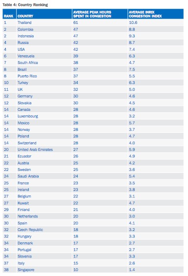 在38个受调查国家中,泰国以高峰拥堵时段司机需要平均花费61小时排在第一位,超过了并列排在第二位的哥伦比亚和印度尼西亚(47小时)。美国成为最拥堵的发达国家,每名司机平均拥堵时长为42个小时。