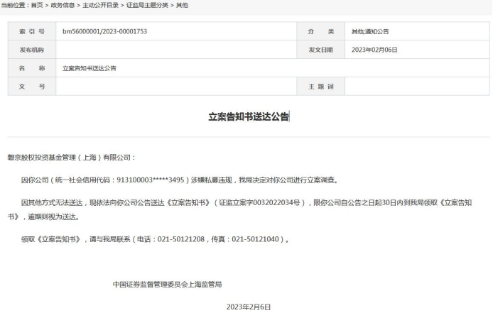 2023年2月,因涉嫌私募违规,上海证监局对磐京进行立案调查。