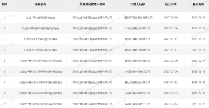 汇盛私募管理规模为10亿元至20亿元,实际办公地在杭州。汇盛基金备案的9只产品,三只已经清算,在运作的有六只。其中有5只标有“量化对冲”字样,该类产品由华福证券、国金证券进行托管。