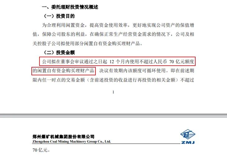 2023年3月末,郑煤机发布了使用闲置资金进行理财的公告,其中指出拟在12个月内使用不超过70亿元的闲置自有资金进行委托理财,如果不出意外,该笔资金已经在2024年3月底前投向了理财产品。