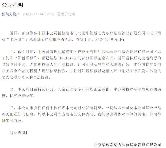 为了维护投资人的合法权益,华软新动力表示,“因汇盛私募发生违约行为导致兑付困难。针对此次重大违约行为,华软新动力已经报案,尽最大努力实现和维护投资人的合法权益”。