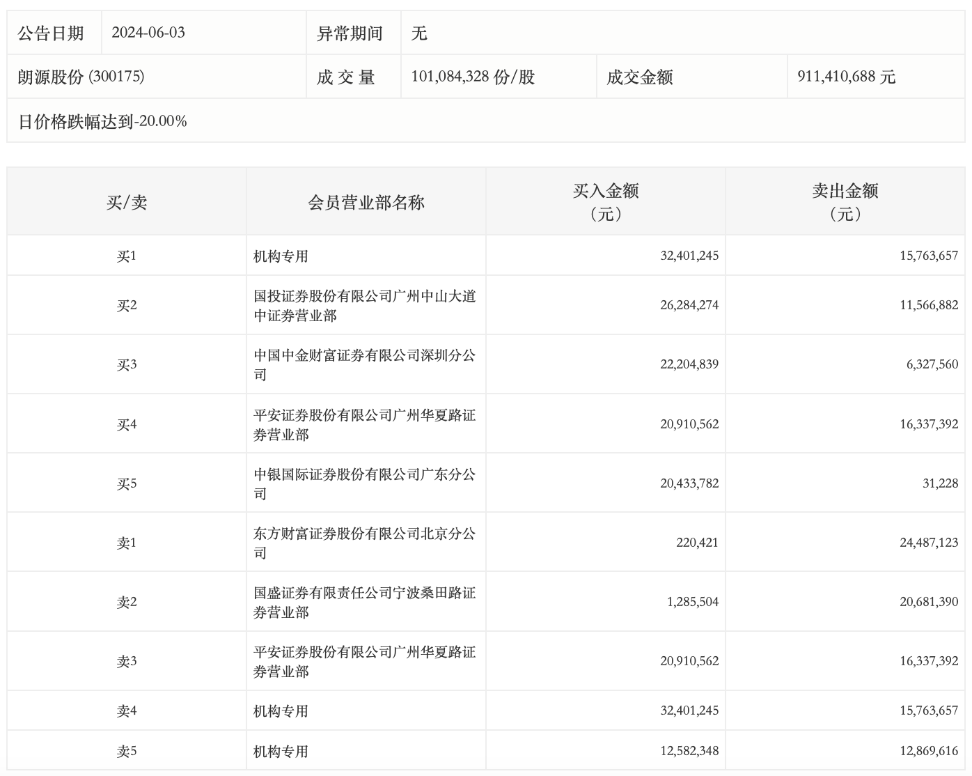 朗源股份今日跌停,龙虎榜数据显示,上榜营业部席位全天成交2.44亿元,占当日总成交金额比例为26.81%。其中,买入金额为1.36亿元,卖出金额为1.08亿元,合计净买入2825.81万元。