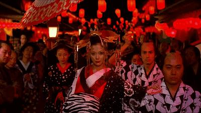 从片中花魁跨坐在男人身上扭动的纤细腰肢,到和服裙摆下露出的光洁小腿,都为电影营造出日本第一花柳街——吉原的奢靡氛围。