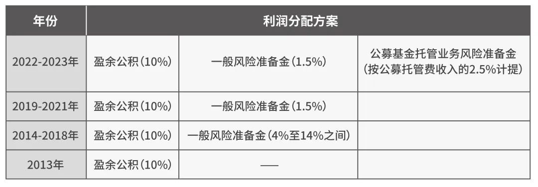 对于将公募基金托管业务风险准备金纳入利润分配计提,招行在2023年度利润分配公告中表示,根据《商业银行表外业务风险管理办法》、《公开募集证券投资基金风险准备金监督管理暂行办法》有关规定,按照本公司2023年度公募基金托管费收入的2.5%计提公募基金托管业务风险准备金0.68亿元。