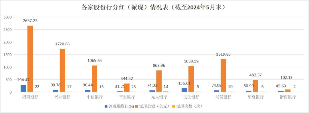 Choice数据显示,截至今年5月末,招行累计融资5次,包括首发融资(1次)、配股(2次)、优先股(1次)、债券(1次),累计融资902.4亿元;累计派现22次,派现总额2657亿元;派现融资比为294.47%。
