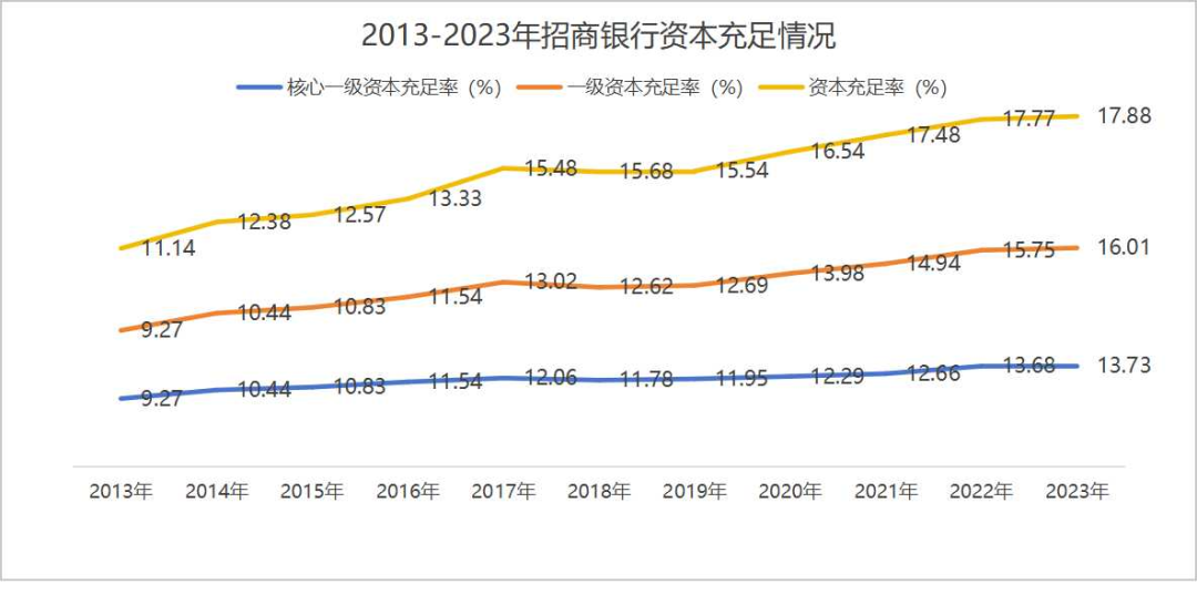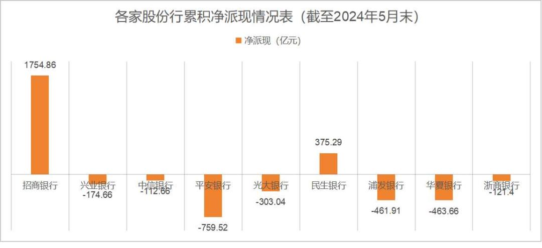 从核心资本充足率指标来看,2013年至2023年,招行的核心资本充足率从9.27%逐年攀升至13.68%;截至今年5月末,招行累计净派现1754.86亿元。目前,股份行中只有2家银行的累计净派现为正值,而招行的累计净派现数额不仅是正值,还是另外一家民生银行(600016.SH,01988.HK)累计净派现数额的4.7倍。