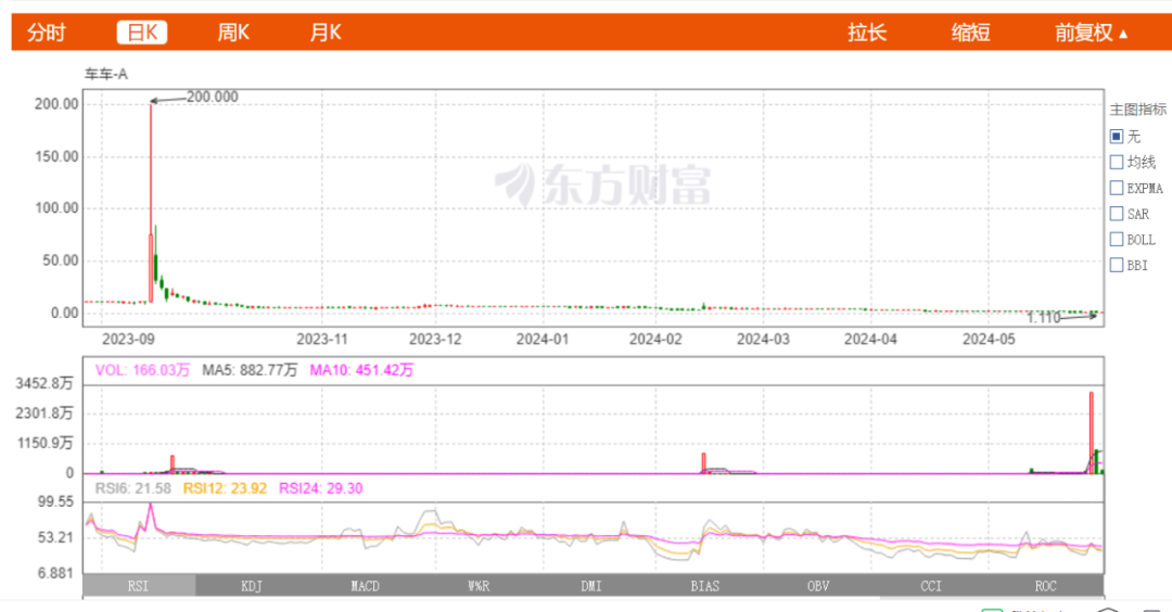 进入2024年,车车科技股价仍没有回暖迹象。今年4月之后,车车科技股价下跌趋势更加明显,5月30日受业绩发布影响,车车科技更是创出了1.11美元/股的股价新低。截至5月31日,车车科技报收1.2美元/股,总市值仅9089万美元。
