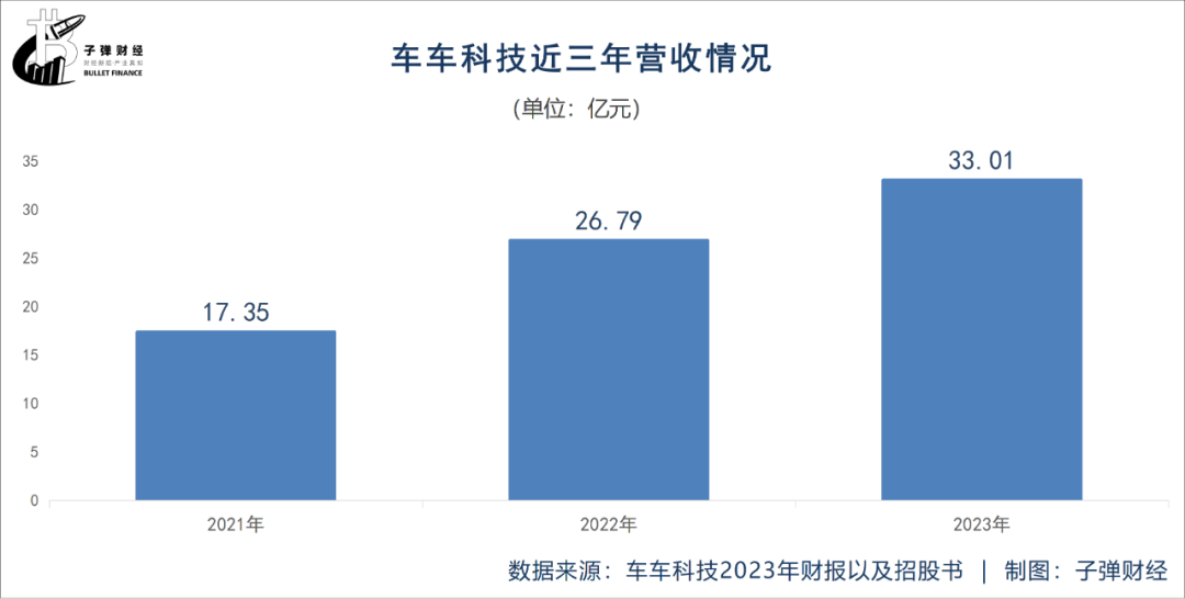 净营业收入方面,2021年至2023年,车车科技分别实现营收17.35亿元、26.79亿元及33.01亿元,2022年和2023年同比增长分别为54.4%、23.2%。