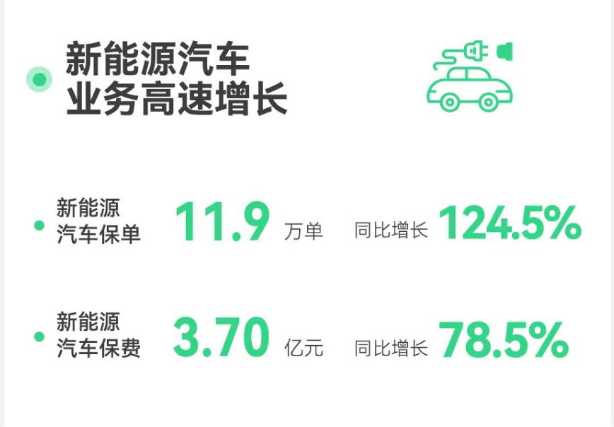 一季度业绩报告显示,在新能源车险业务上,车车科技新能源汽车保单数达11.9万单,同比增长124.5%;新能源车险保费达3.7亿元,同比增长78.5%。