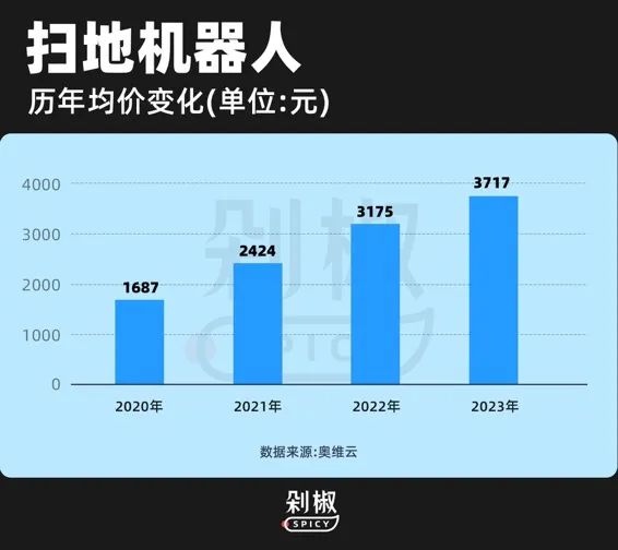 根据奥维云网数据,今年4月中国家电市场中,扫地机器人的线上和线下均价分别来到3221元和4547元,同比增长分别为3.1%和6.6%。2020年—2023年,中国扫地机器人行业均价分别为1687元、2424元和3175元和3717元,增长趋势明显。
