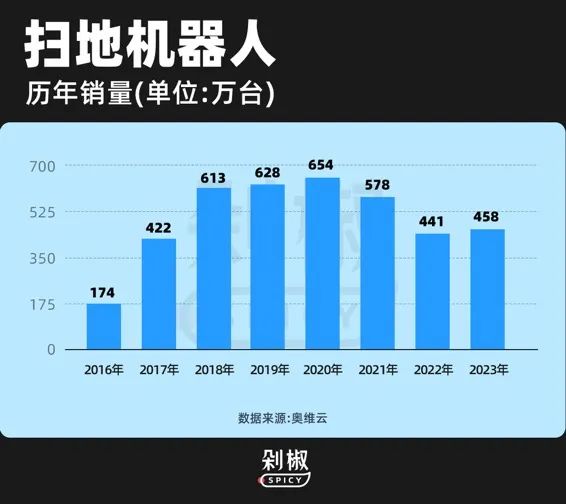 2016年中国扫地机器人销量174万台,次年提高到422万台。2018年-2020年是高速发展期,年销售额分别为613万台、628万台和654万台。就在行业一片乐观时,殊不知度过尝鲜期,第一轮消费透支后便极速下滑。2021-2023年,扫地机器人销量578万台、441万台、458万台。2022年可谓行业的滑铁卢之年。