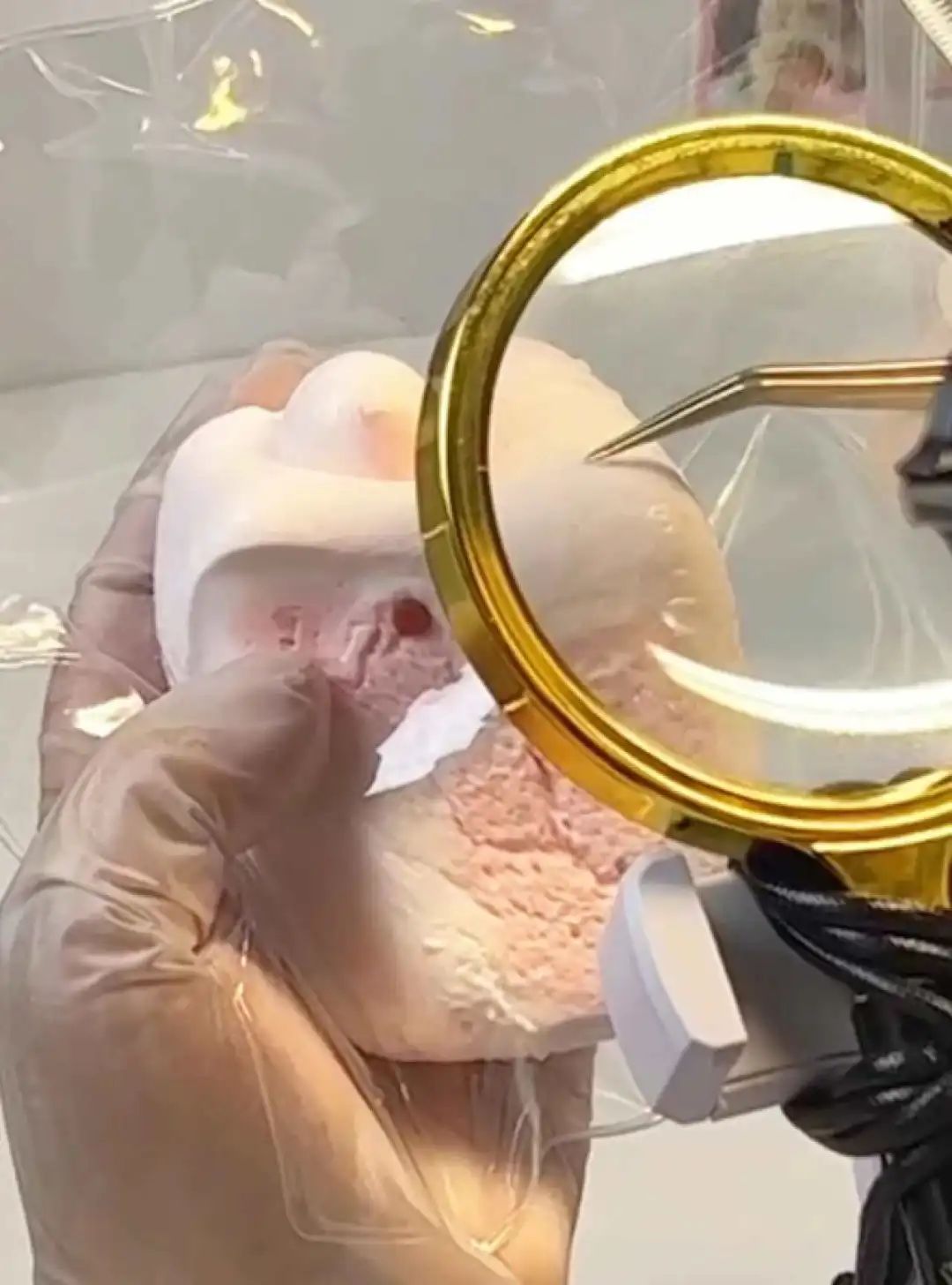 牛奶告诉「定焦」,他们有专门的员工负责装袋质检,每个员工配备台灯、放大镜、镊子,以及一次性的防护服和防尘帽。一个“捏捏”的挑毛和挑黑点工作就需要30分钟,清洗4轮,揉搓200+次。每轮揉搓不到位,都会导致“捏捏”表面凡士林无法清洗干净,导致糊在袋子上。