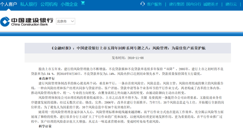 到了2010年,四年改革见著成效,建行不良贷款率下降到1.14%。