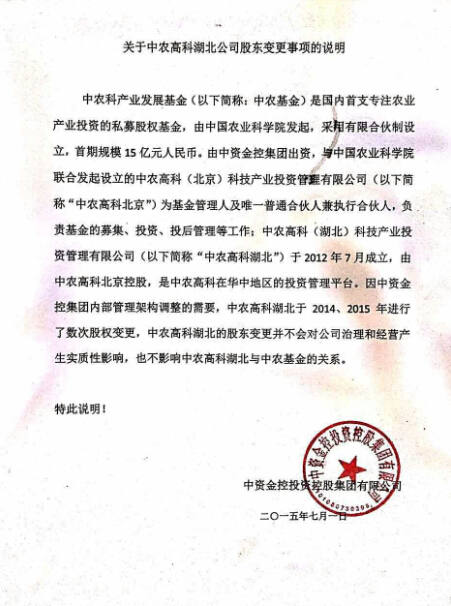 界面新闻记者掌握的一份名为中农高科湖北公司股东变更事项说明的文件中显示,“中农基金是由中国农业科学院发起采用有限合伙制设立的国内首支专注农业产业投资的私募股权基金”,而“中农高科(北京)科技产业投资管理有限公司(下称中农高科)为中农科产业发展基金管理人及唯一普通合伙人兼执行合伙人,负责基金的募集、投资、投后管理等工作”。