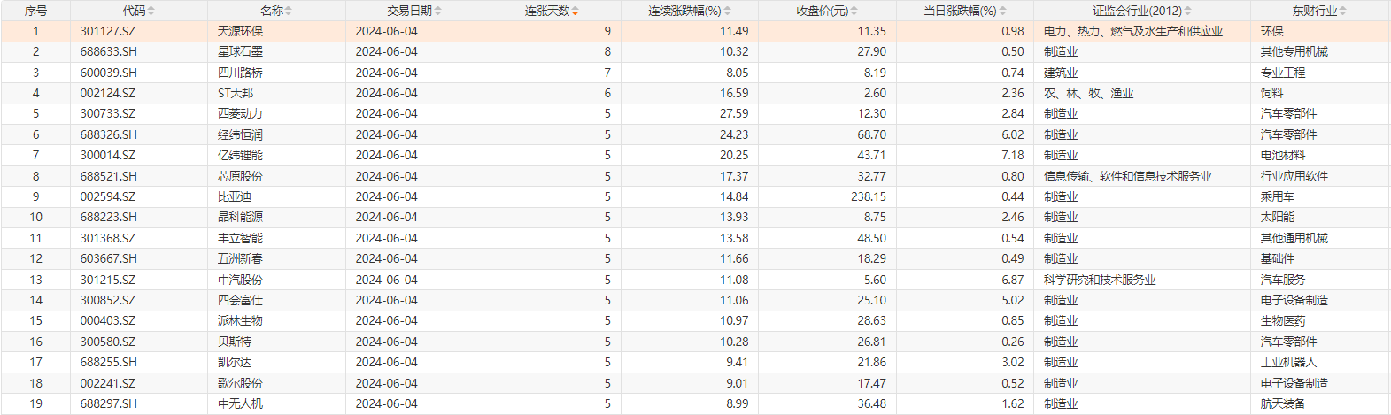 Choice数据统计,6月4日,今日1只个股连续9天上涨,为天源环保;1只个股连续8天上涨,为星球石墨;此外,四川路桥连续7天上涨;ST天邦连续6天上涨。
