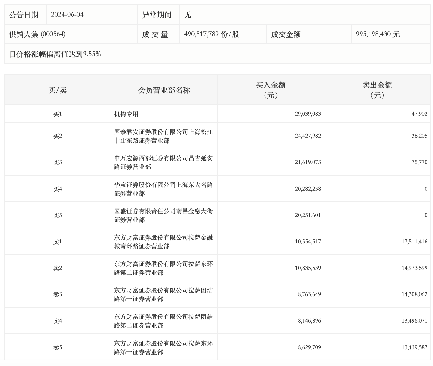 6月4日,供销大集今日涨停,成交额9.95亿元,换手率3.23%,盘后龙虎榜数据显示,一机构专用席位净买入2899.12万元,卖方前五均为“散户大本营”席位。