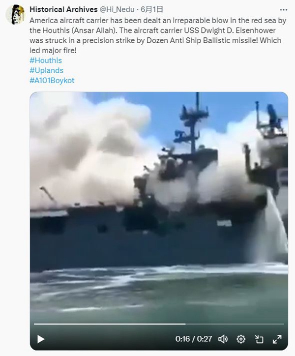 但美国中央司令部公布的信息没有平息外界的质疑,社交媒体上流出了大量声称“艾森豪威尔”号被击中起火的视频。部分视频被认出为游戏画面,还有一段视频实际为美军“好人理查德”号两栖攻击舰2020年发生火灾的画面。