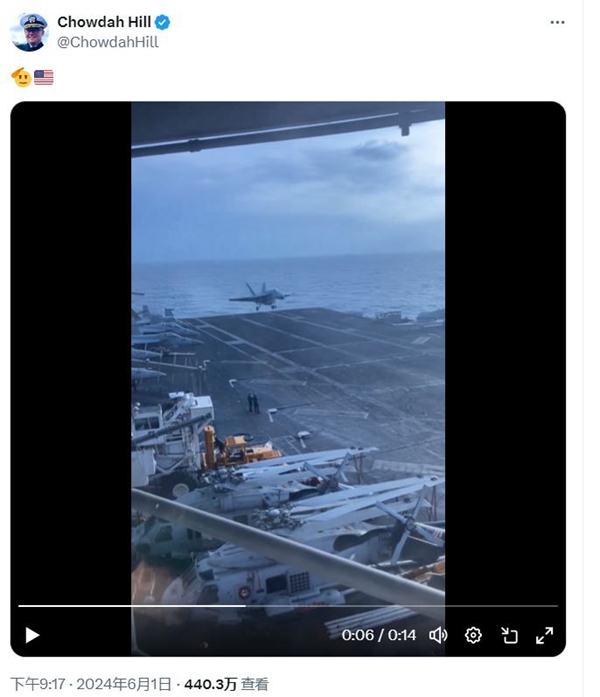 为进一步澄清,希尔从6月2日开始先后发了五段在“艾森豪威尔”号上的视频和照片,包括与工作人员的合影和舰载机降落的场景。
