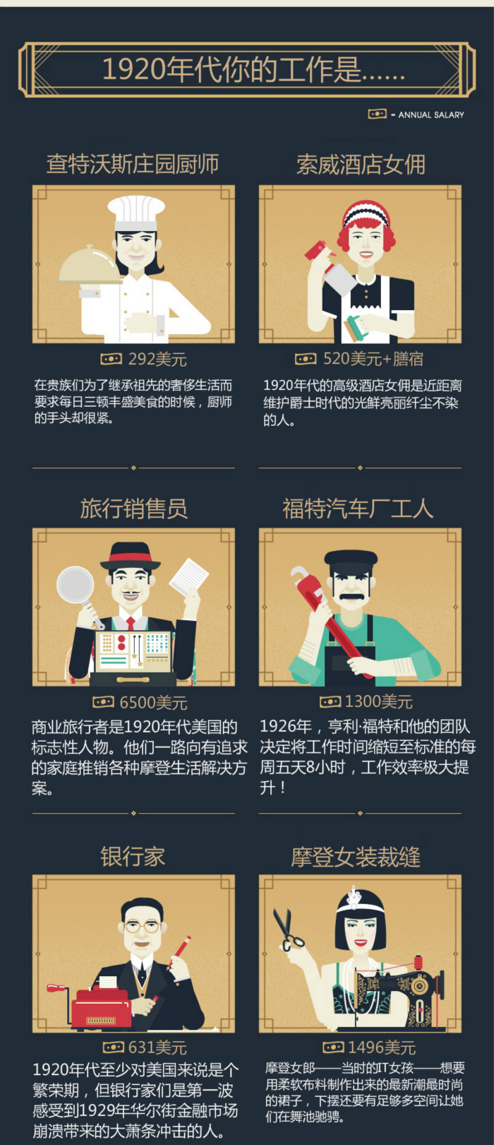 个人贷款公司On Stride Financial制作了一张图,告诉你1920年代的美国都有些什么样的工作,能获得什么样的报酬。不要急着感到惊讶,有些看似并不重要的工作在当时意义重大,而这也提醒我们一点:人无千日好,花无百日红。谁知道22世纪的人不会取笑我们当下的工作呢。
