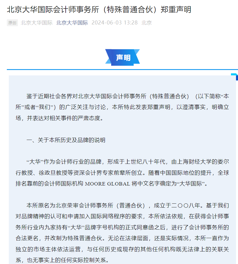 6月3日,北京大华国际会计师事务所(特殊普通合伙)(简称“北京大华国际”)在官微发布声明,称其一直作为独立的市场主体依法运营,与任何历史或现存的其他任何机构既无法律上的关联关系,也无事实上的任何实际控制关系。