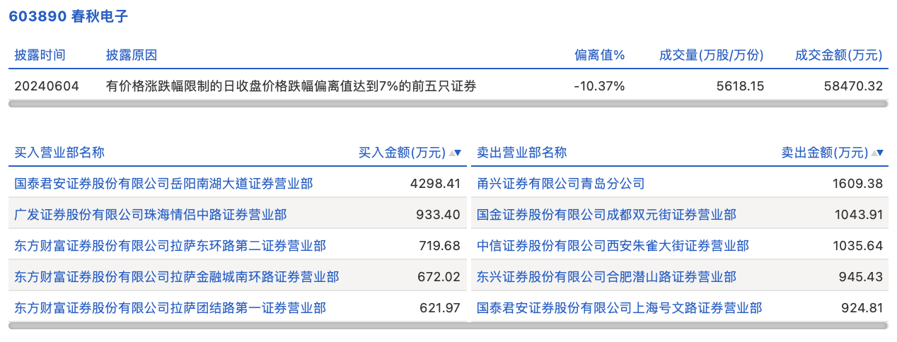 6月4日,春秋电子今日跌停,龙虎榜数据显示,上榜营业部席位全天成交1.28亿元,占当日总成交金额比例为21.9%。其中,买入金额为7245.49万元,卖出金额为5559.16万元,合计净买入1686.32万元。