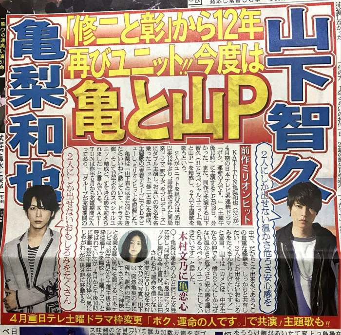 据日媒消息,由龟梨和也和木村文乃担当男女主角的日本电视台4月档新剧《我命中注定的人》,请来了山下智久作为特别出演,并由山下智久和男主角龟梨和也组成限定组合“龟和山P”,演唱电视剧主题曲。从日媒报道的版面就可以看出,大家对二人的合作有多期待,真女主几乎没有版面。