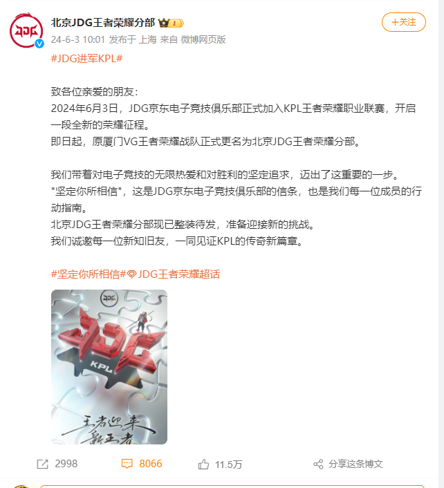 从而带来的一个格局是,当下KPL的16个常规席位当中,有了京东,有了滔博,有了快手,有了微博,还有TT语音、复星集团、星竞威武、华硕、斗鱼。