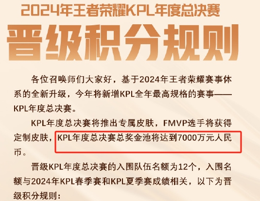 今年3月份,王者荣耀KPL官方发布了全新的年度总决赛的积分晋级规则,而其中最受瞩目的显然就是高达7000万元的奖金池。