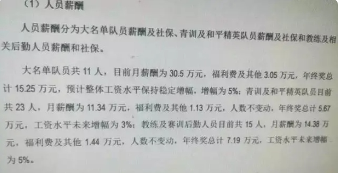 在这份《报告书》中提到,Hero久竞王者分部大名单队员共11人,目前月薪酬为30.5万元,福利费及其他3.05万元,年终奖总计15.25万元,预计整体工资水平保持稳定增幅,增幅为5%。