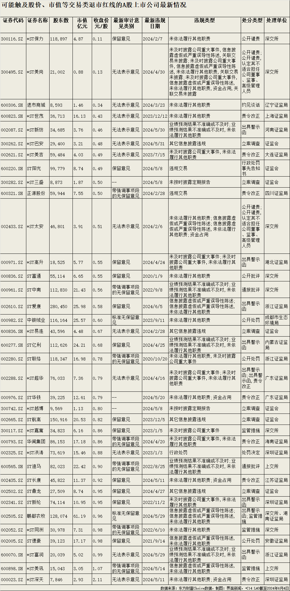 界面新闻统计发现,截至2024年6月4日收盘,已有34家A股上市公司最新收盘价跌破1元/股的“面值退市”警戒线。其中,退市商城(600306.SH)已进入退市整理期, *ST新纺(002087.SZ)将于6月6日进入退市整理期, 正源股份(600321.SH)、*ST保力(300116.SZ)、*ST世茂(600823.SH)、 ST中南(000961.SZ)等公司则已经明确收到交易所终止上市通知。