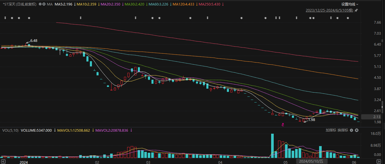 6月5日,*ST深天(000023.SZ)再次一字跌停,触及5.21%跌停线,股价报2元/股,最新市值2.78亿元。至此,该公司股价已经连续收到三个跌停板。